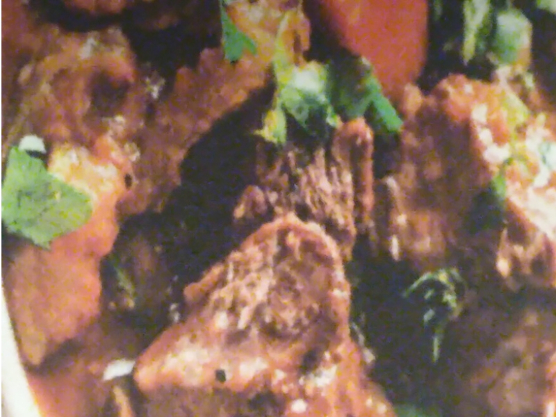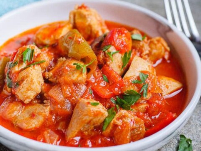 Boneless white meat chicken in a tomato stew with paprika, curry powder, black pepper, tumeric and salt, ginger and cumin, and chicken masala
