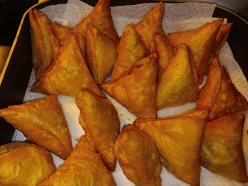 Fried pastries, wrapped with either seasoned ground beef or vegetables