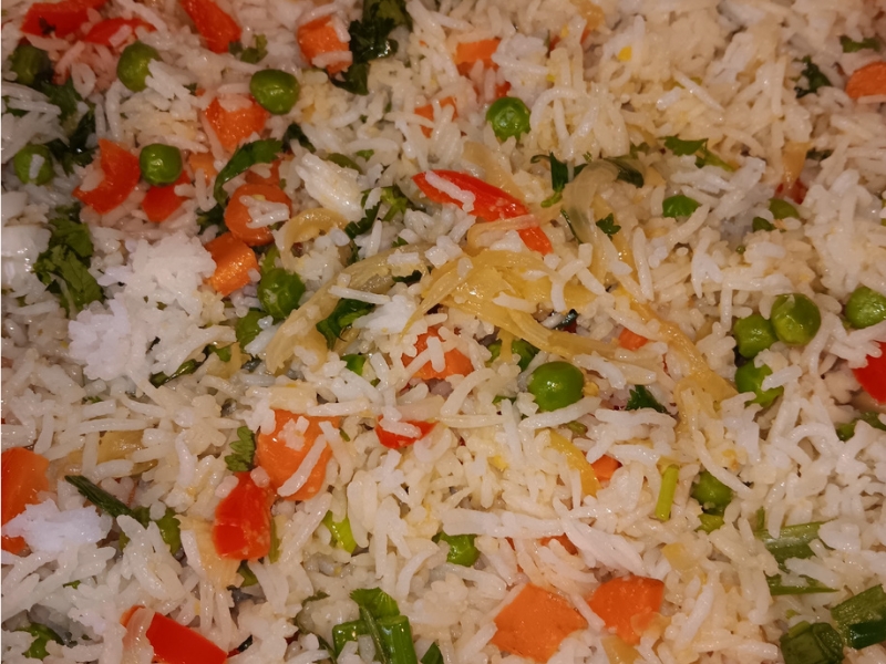 White rice mixed with soy sauce, carrots, ginger, garlic, onions, peppers, and peas